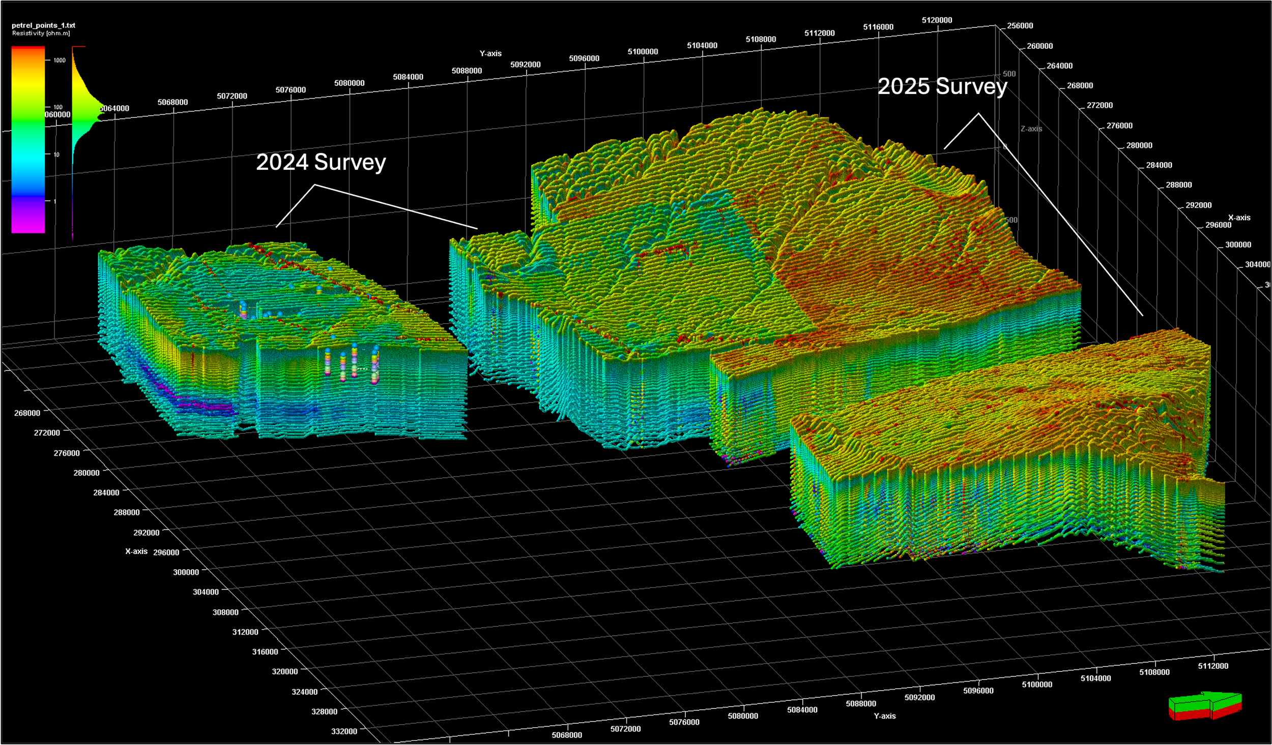 FIG 5 | Perspective view of a 3D resistivity image of the subsurface obtained by integrating data from the 2024 and 2025 airborne EM surveys. Colors in the image correspond to values of electrical resistivity in the color scale at the upper left of the plot.